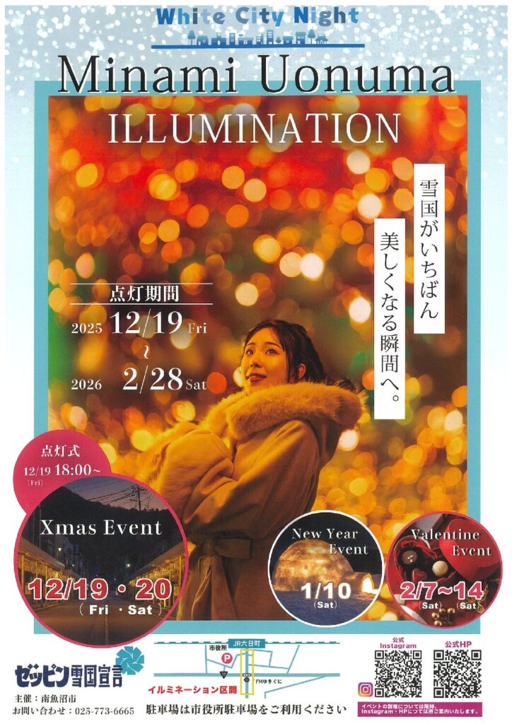 JR六日町駅東口にある駅前商店街にて「MINAMIUONUMA White City Night」と題してイルミネーションが開催されます。 氷柱をイメージしたアイシクルライトでアーケードに装飾し、幻想的に輝かせます。 ア […]